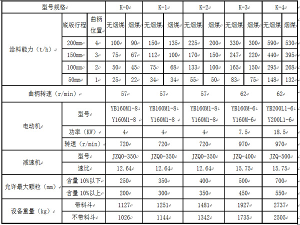 K型往復式給煤機由機架、底板(給煤槽)、傳動平臺、漏斗、閘門、托輥等組成。當電機開動后經彈性聯軸器、減速機、曲柄連桿機構拖動傾料5°的底板在輥上作直線往復運動,煤均勻地卸到其他設備上。