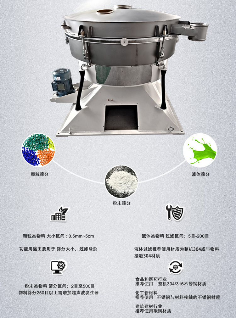不銹鋼搖擺篩是一種仿人工搖動的低頻旋振篩,其原理是:瞬時運動為沿徑向的位移和以此位移為軸的圓周運動的合成(螺旋運動)。即可調節偏心距的激振器產生了非線性三維運動,物料也產生同樣的近似手動作業的運動,從而達到篩分之目的,再配合篩分附件可得到更加理想的篩分效果;適合于圓球狀、圓柱狀、片狀、乃至不規則形狀易堵網且需要精密篩分的物料。(篩分精度、效率、篩網壽命均是常規圓篩的5-10倍),符合所有精細與超細范圍的粉末與微粒狀物料,特別適合難以處理的物料。并可以根據物料的物理特性,客戶的不同篩分要求對相互立可調的轉速,偏心距,徑向力進行調整,改變物料在篩面停留時間和運動路線,達到篩分效果。偏心率從25到40mm可調,搖擺頻率從120到360rpm可調,當接通電源后,其篩箱在振動裝置的驅動下作近似圓周運動,此時篩箱帶動整個篩面做周期性運動,篩面上的物料隨著篩箱在篩網上做定向跳躍式運動,在此過程中,小于篩網孔徑的物料落到篩網下層,從下出料口排出,大于篩網孔徑的物料從上出料口排出,中間層則從中出料口排出,以此來完成整個篩分工作。