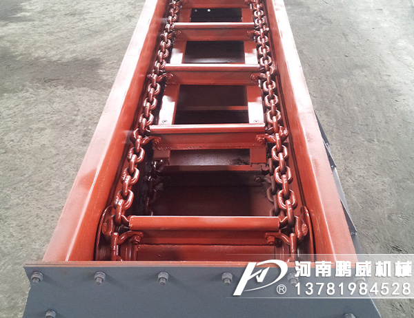 刮板輸送機的工作原理是,將敞開的溜槽,作為煤炭、矸石或物料等的承受件,將刮板固定在鏈條上(組成刮板鏈),作為牽引構件。當機頭傳動部啟動后,帶動機頭軸上的鏈輪旋轉,使刮板鏈循環運行帶動物料沿著溜槽移動,直至到機頭部卸載。刮板鏈繞過鏈輪作無級閉合循環運行,完成物料的輸送。